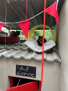 Wooden villas on stilts, each with their own garden, that can comfortably accommodate 2 kitties from the same family. These villas have multiple levels for lounging in the sun, with trees for shade. Panel heaters, beds and blankets included.